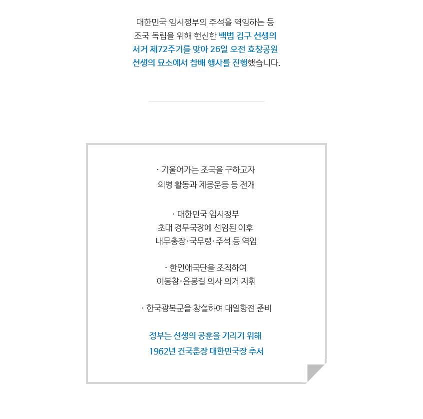 국가보훈처 - 백범 김구 선생 서거 72주기, 6월 26일 선생 묘소에서 참배로 추모식 대체